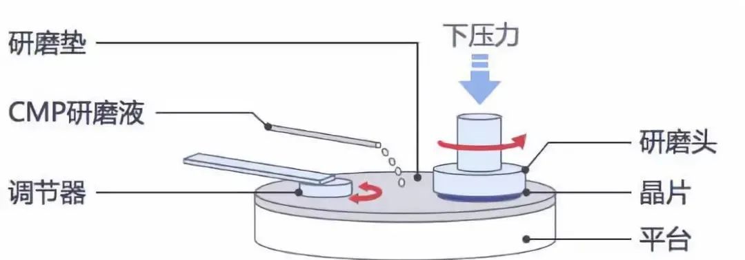 在CMP制程的硬设备中,研磨头被用来将晶圆压在研磨垫上并带动晶圆旋转,至于研磨垫则以相反的方向旋转。在进行研磨时,由研磨颗粒所构成的研浆会被置于晶圆与研磨垫间。影响CMP制程的变量包括有:研磨头所施的压力与晶圆的平坦度、晶圆与研磨垫的旋转速度、研浆与研磨颗粒的化学成份、温度、以及研磨垫的材质与磨损性等等。