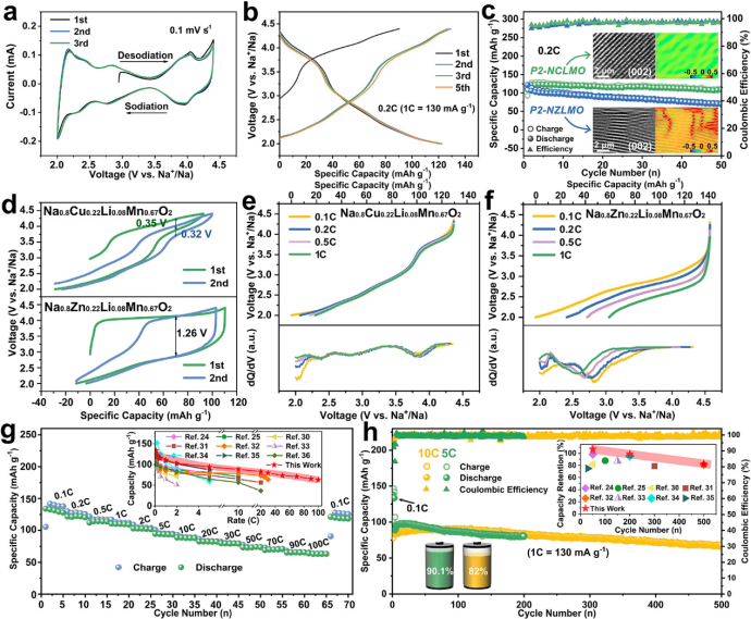 【图2】(a)0.2 mV s-1下的CV曲线和(b)0.2C时P2-NCLMO正极的恒流充放电曲线。(c)P2-NCLMO和P2-NZLMO在0.2C时的循环稳定性和(d)电压滞后。插图显示了两个样品经过50次循环后的HRTEM图像和相应的GPA图像。(e)P2-NCLMO和(f)P2-NZLMO从0.1C增加到1C时的放电曲线和相应的dQ/dV图。(g)P2-NCLMO在5C和10C下的倍率性能和(h)长循环稳定性。插图显示了本研究与报道的Cu–Mn基钠层状氧化物的比较。