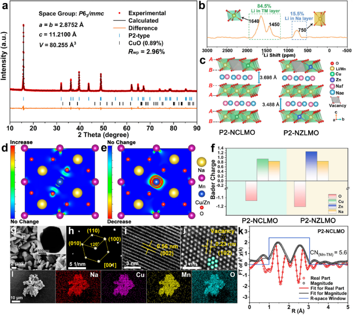 【图1】P2-Na0.8Cu0.22Li0.08Mn0.67O2的(a)XRD精修谱图和(b)7Li ss-NMR谱。(c)P2-NCLMO和P2-NZLMO晶体结构示意图。氧化物体系中Cu取代Zn的电荷密度差;(d)和(e)分别表示电荷的增加和减少。(f)P2-NCLMO和P2-NZLMO中O、Cu、Zn和Na离子的Bader电荷。(g)P2-NCLMO的SEM和TEM(插图)图像,(h)SAED图像,(i, j)HRTEM图像。(k)P2-NCLMO的Mn k边FT-EXAFS谱。(l)P2-NCLMO样品的SEM-EDS图谱。