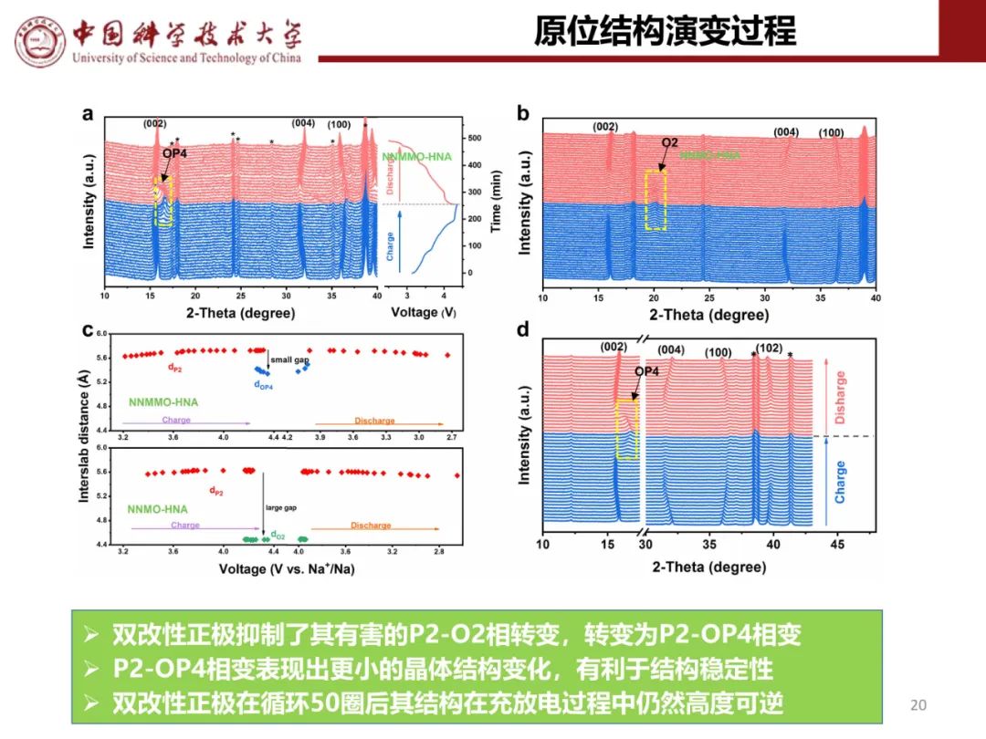 在2.0-4.4 V的电压范围内进行原位XRD测量,研究了P2-NCLMO的结构演变(图3a,b)。在充电过程中,(00l)峰逐渐向低角度区域移动,说明Na+脱出后相邻氧层间静电斥力增大,导致层间距扩大。同时,(101)峰不断向更高的角度移动,表明由于TM离子氧化导致ab平面收缩。在接下来的放电过程中,所有衍射峰都经历了可逆的移动,(001)和(101)峰比原始状态分别向更高和更低的角度移动,这是由于在初始循环中插入的Na+比脱出的Na+多。在整个充放电过程中,没有出现额外峰或原始峰消失/分裂,表明P2-NCLMO电极的固溶反应非常稳定。这是因为低价Li+掺杂确保了Na层中有足够的钠来稳定在深度充电状态下的P2结构,并有效地减轻了Na+/空位的有序化。P2-NCLMO的最大单胞体积变化仅为1.26%,远小于之前报道的P2型钠离子氧化物正极(图3c),说明P2-NCLMO具有出色的循环稳定性。