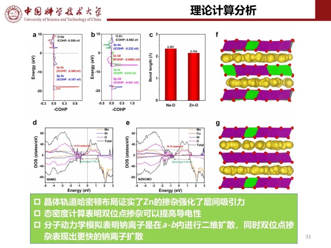 采用恒流间歇滴定技术(GITT)评估Na+扩散系数(DNa,图4a)。计算得出P2-NCLMO的DNa值保持在10-10 cm2 s-1量级,远高于P2-NZLMO(10-15-10-10 cm2 s-1)和其他具有阴离子氧化还原化学性质的钠层氧化物正极(主要在10-12-10-11 cm2 s-1范围内)。图4b显示了由GITT结果得到的反应电阻,在整个充放电过程中,P2-NCLMO的反应电阻远低于P2-NZLMO的反应电阻。值得注意的是,在高压区域DNa值较高,反应电阻较低,表明P2-NCLMO的氧反应动力学更容易。还记录了不同扫速(0.1~1.0 mV s-1)下P2-NCLMO的CV曲线,以估计Na离子的扩散率(图4c,d)。计算得到O1、O2、O3、R1、R2、R3峰的DNa值分别为1.77 × 10-10、1.76 × 10-10、2.63 × 10-10、2.46 × 10-10、2.19 × 10-10、2.09 × 10-10 cm2 s-1。采用非原位拉曼光谱研究了TM在P2-NCLMO和P2-NZLMO中的迁移行为。约490和约590 cm-1处的峰是Na-O键的不对称拉伸(E2g)引起的,约650 cm-1处的峰是TM-O键的对称拉伸(A1g)引起的。图4e显示,E2g峰强在脱钠过程中明显降低,在钠化过程中明显增加,而P2-NCLMO的TM-O振动在充放电过程中没有明显变化,说明TM局部环境得到了很好的维持。因此,金属离子迁移在P2-NCLMO中得到有效缓解。相反,当P2-NZLMO正极充满电至4.4 V时,在≈680 cm-1处出现了一个新的尖峰(A′1g),这是由于面外阳离子迁移形成了新的TM局部环境(图4f)。放电至2.0 V时,该峰仍然存在,证实了P2-NZLMO中Zn离子从TM层向Na层的不可逆迁移。过量氧氧化后,由于Zn-O配位减弱,导致Zn2+迁移严重,Na+扩散途径受阻,随之导致Na离子扩散系数下降,反应动力学迟缓,倍率性能差,如图4g所示。