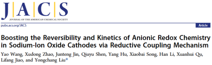 北京科技大学刘永畅教授,揭示了一种新型P2-Na0.8Cu0.22Li0.08Mn0.67O2正极中罕见的电子从氧转移到铜离子的还原偶联机制(RCM),以提高阴离子氧化还原反应可逆性和动力学。由此形成的强共价Cu-(O-O)键能有效抑制过量的氧氧化和不可逆阳离子迁移。因此,P2-Na0.8Cu0.22Li0.08Mn0.67O2正极提供了优异的倍率容量(在0.1C和100C时分别为134.1和63.2 mAh g-1)和出色的长循环稳定性(在10C下500次循环后容量保持率82%)。通过系统的原位/非原位表征和理论计算,充分了解了RCM的内在作用机制。该研究以题目为“Boosting the Reversibility and Kinetics of Anionic Redox Chemistry in Sodium-Ion Oxide Cathodes via Reductive Coupling Mechanism”的论文发表在国际顶级期刊《Journal of the American Chemical Society》上。