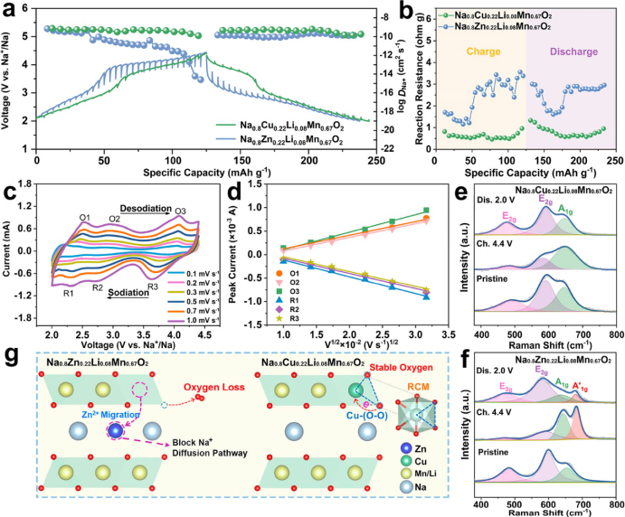 【图4】(a)0.2C时P2-NCLMO和P2-NZLMO电极的充放电GITT图及相应的Na+扩散系数。(b)根据GITT测试结果得到的反应阻力。(c)P2-NCLMO在0.1~1.0 mV s-1扫速下的CV曲线;(d)峰电流(ip)与扫速平方根(v1/2)之间的线性关系。(e)P2-NCLMO和(f)P2-NZLMO的非原位拉曼光谱。(g)还原耦合机制引起的反应动力学增强示意图。