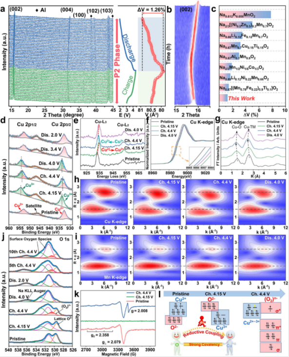 【图3】(a)0.2C第一次循环时P2-NCLMO电极的原位XRD谱图及相应的体积变化,(b)(002)峰等高线图。(c)P2-NCLMO正极和以前报道的SIB的P2型正极之间的最大单胞体积变化的比较。(d)Cu 2p XPS谱,(e)Cu L边EELS谱,(f)Cu K边XANES谱,(g)P2-NCLMO相应的FT-EXAFS谱。不同电压状态下(h)Cu和(i)Mn K边WT-EXAFS谱线图(j)不同电化学状态下P2-NCLMO的O 1s XPS光谱。(k)P2-NCLMO在原始状态、充电至4.15 V和充电至4.4 V时的EPR谱。(l)Cu 3d和O 2p轨道电子构型在初始脱钠过程中的演化示意图。