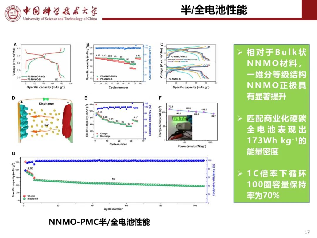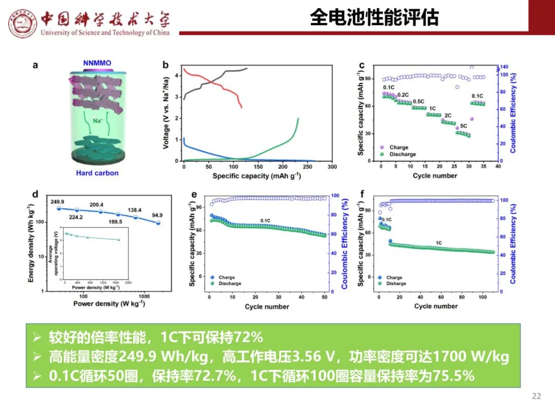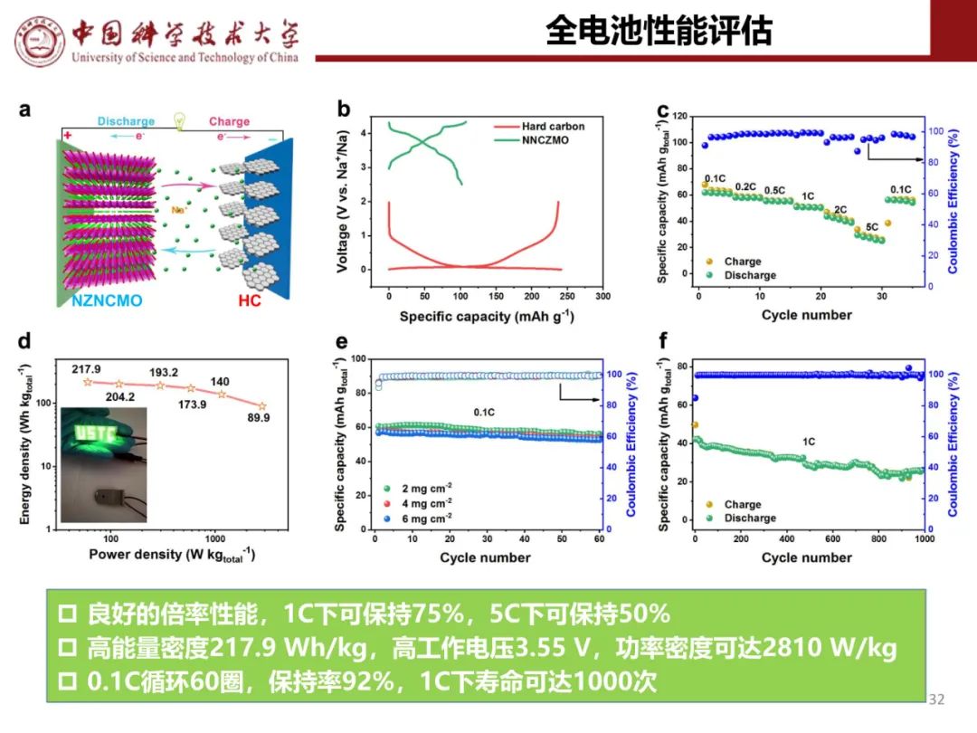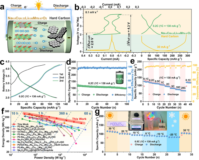 【图6】(a)P2-NCLMO//硬碳全电池示意图。(b)P2-NCLMO正极和HC负极的循环伏安图和充放电曲线。(c)恒流充放电曲线,(d)循环性能,(e)倍率性能。(f)P2-NCLMO//硬碳全电池和最近报道的钠离子全电池系统的Ragone图(基于正极和负极的总质量)。(g)全电池在不同温度下的比容量。插图显示了P2-NCLMO正极材料的批量生产和由软包电池供电的LED。
