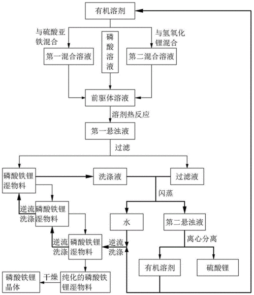 (4)液相共沉淀法:该法原料分散均匀,前躯体可以在低温条件下合成。将LiOH加入到(NH)Fe(SO).6HO与HPO的混合溶液中,得到共沉淀物,过滤洗涤后,在惰性气氛下进行热处理,可以得到LiFePO;产物表现出较好的循环稳定性。日本企业采用这一技术路线,但因专利问题目前尚未大规模应用。
