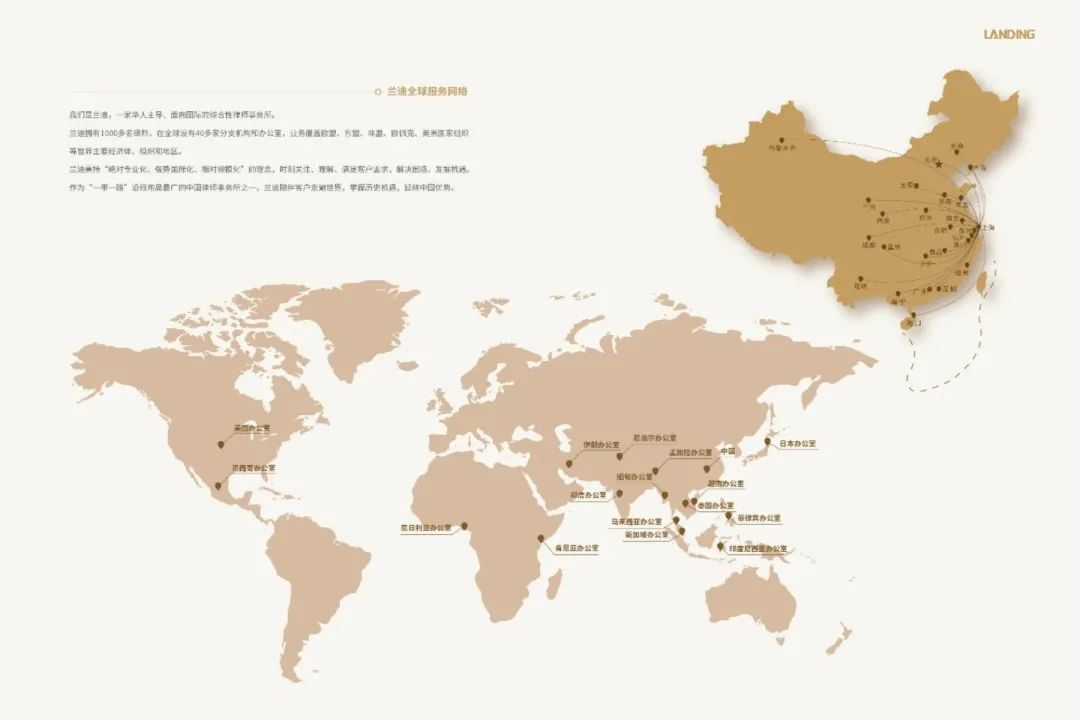 我们是兰迪,上海兰迪律师事务所(以下简称“兰迪律所”)是一家正在快速发展的综合性国际化律师事务所,秉持“绝对专业化、强势国际化、相对规模化”的发展理念,致力于打造由华人主导的国际大所、强所。总部设在中国上海市并已在国内外设立41家分所或办公室,已发展成为在“一带一路”沿线发展中国家布局最广的中国律师事务所之一,且分所及办公室还在迅速增加中。