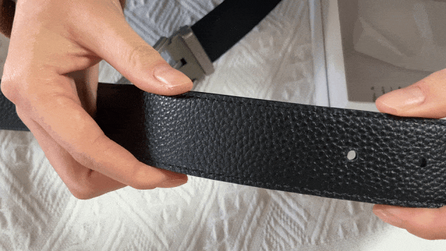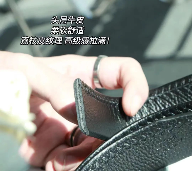 封边工艺更加精细,皮带整体的皮质纹路十分的清晰细腻,而且色泽光亮,弹性很好,兼具耐用及美观,看上去质感十分的高级。