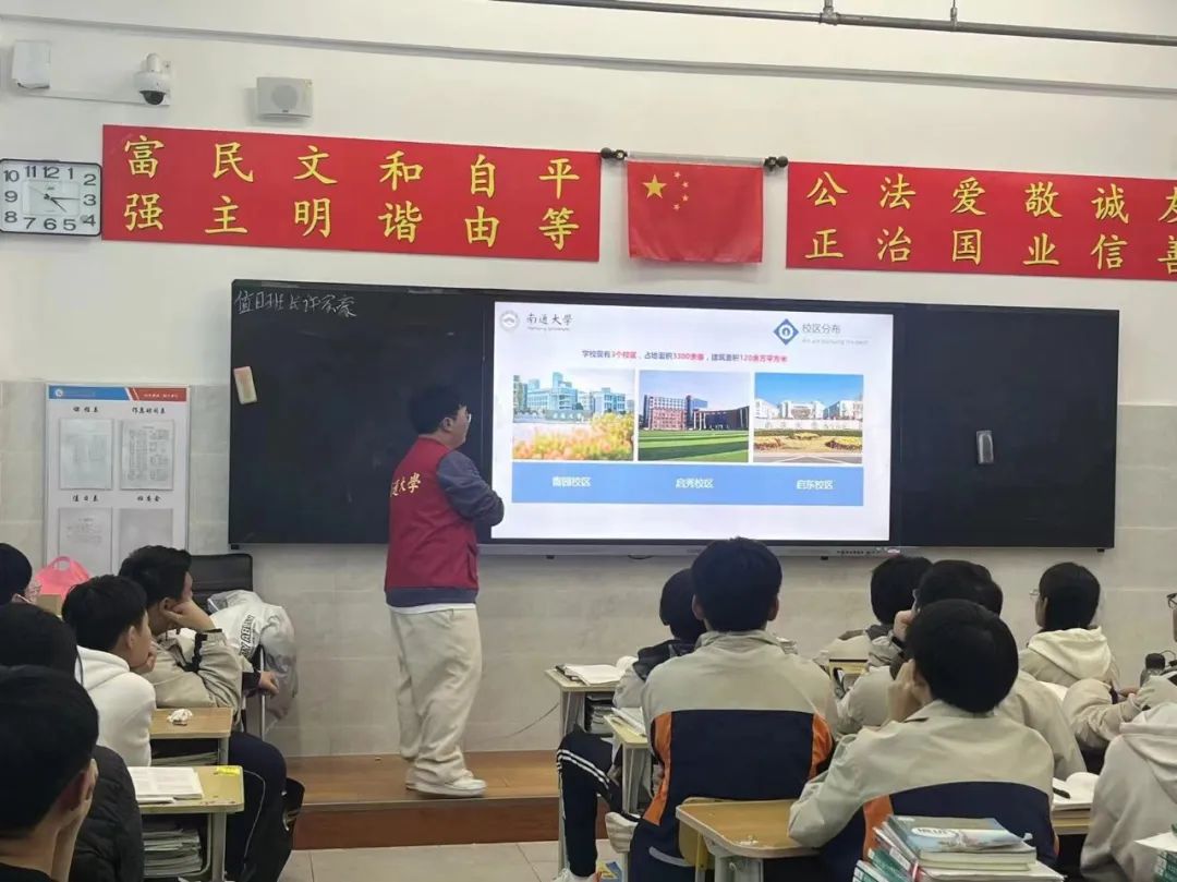 正式宣讲的过程中,王博同学先播放了南通大学的相关视频,吸引学生们的兴趣;接着,他向学弟学妹们生动讲述了南通大学的历史沿革、学科优势、教育教学、科研实力、招生政策以及校园环境;而后,他分享了自己当年报考南通大学时的经验和感想,提出了一些建议;最后,王博同学留下了南通大学的官网、微信公众号、邮箱和学校电话,希望学弟学妹们记下并与学校建立联系,相信南通大学将是他们无悔的选择!