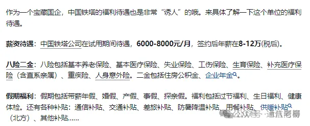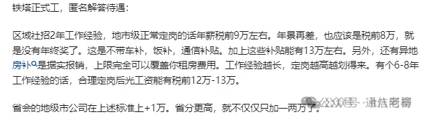 网上看到一些网友爆料了中国铁塔的员工待遇情况,总体看还不错,年薪能过12万,也算是高收入人群了。中国铁塔这样的好公司,还是值得年轻人去奋斗的!