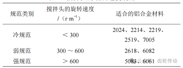 表 1 搅拌头的旋转速度规范