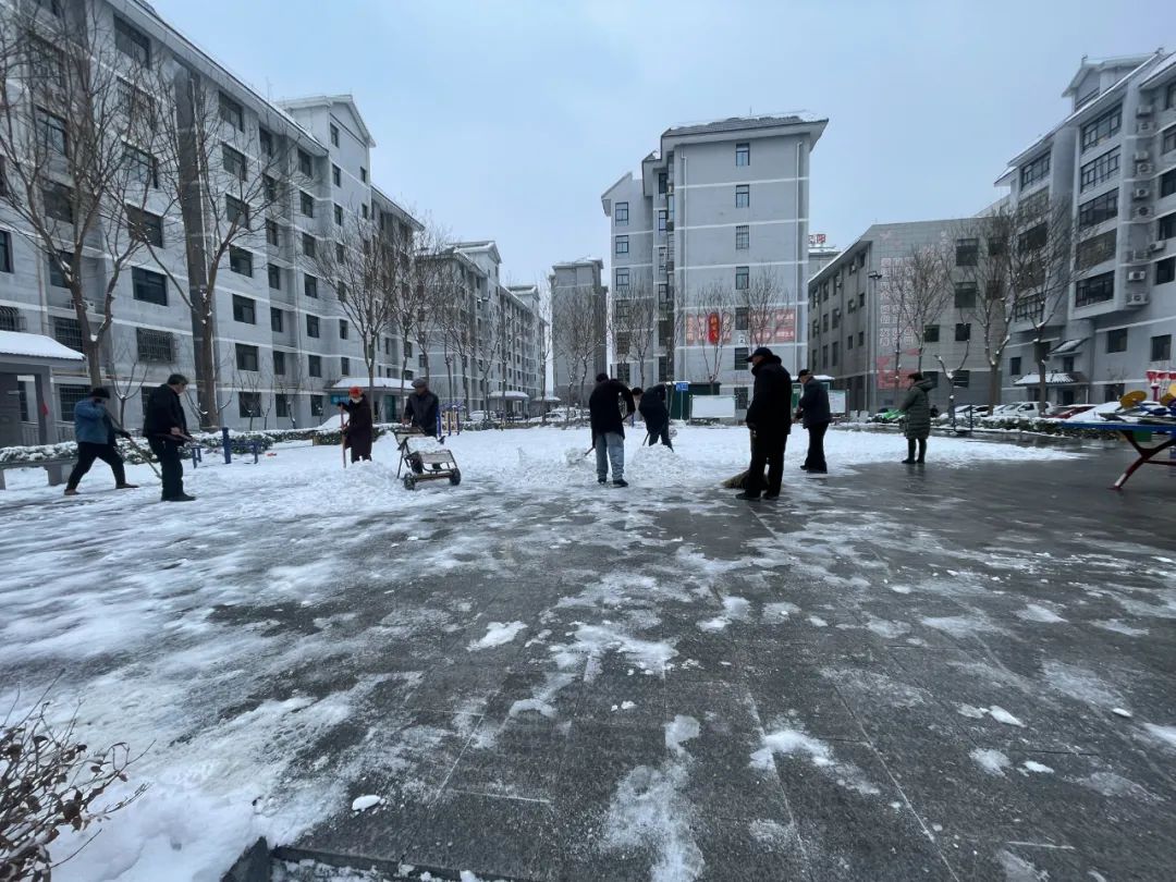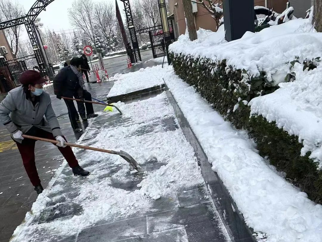 城市嘉园小区物业工作人员对小区公共区域积雪进行清理,以确保居民出行安全。