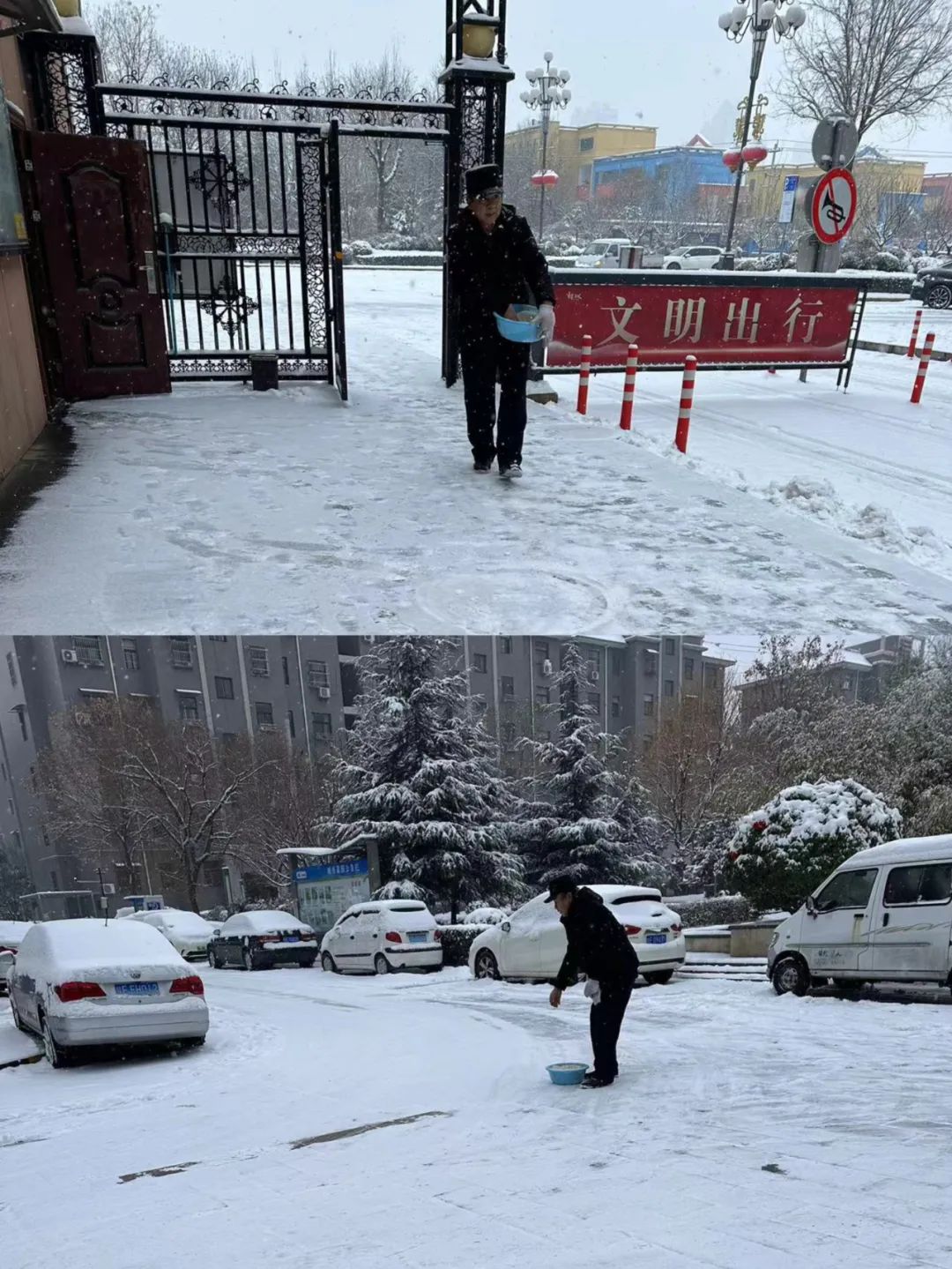 城市嘉园小区物业工作人员对小区公共区域路面进行撒盐加快积雪融化。
