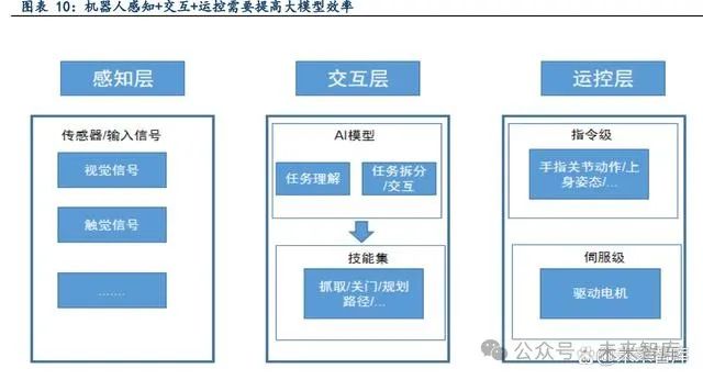 任务级交互+时效性是机器人控制难点。一般而言,机器人在执行任务的时候,需要通过传感 器去感知周边环境情况,收集图像、语音信息,之后通过自身处理器和 AI 大模型去理解任务, 再将任务拆分成可以执行的步骤。机器人本身通过机器训练等具有一定技能集合,这些可执行 步骤经由机器人具体执行,转换为各个部件传统运控系统可执行的信号。但这些任务级交互需 要较高的 AI 大模型决策能力和理解能力;同时,对任务拆解-运控规划的时效性也具有一定要 求,需要机器人与环境交互时更快、更精确地执行任务,这意味着大模型效率需要进一步提升。