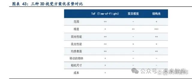 3D 视觉技术较多,主要有 ToF (Time-of-Flight)、双(多)目视觉、结构光等。目前人形机 器人主要采用的方案是多目视觉、TOF。 1) ToF 可用于测量距离以获得深度数据。集成在相机中的光源可发出光脉冲照射到物体上, 物体将光脉冲反射回相机。根据光脉冲所需的时间,可以确定被测物每个点与相机的距离 信息,从而得到深度值。与其他 3D相机相比,ToF 相机更为经济、精巧和简单,可实现轻 松安装和集成。不过,ToF 相机仅在特定环境条件下和定义的测量范围内,才能提供理想 的采集结果。 2) 双(多)目视觉的工作原理与人眼类似。其 3D 原理是使用两(多)台 2D 相机从不同视角 拍摄同步的图像,从而获得深度信息。为了计算3D数据,必须知道两(多)台相机之间的 相对位置(外部参数),然后使用适配算法在左右图像中搜索相应的像素,最后借助校准 值,就可以将场景或物体的深度图像生成为点云。对于结构简单的表面,由于双目视觉方 法在两个图像中拍摄到的相应特征不足,因此无法从中计算出三维信息。 3) 与双目视觉技术不同,结构光技术需要将其中一台相机替换为条纹光投影仪。它会投影具 有正弦强度曲线的各种条纹状图案,从而在表面上创建系统已知的人造结构。在表面上投 影的条纹变形可用于计算3D信息,并获得更准确的测量结果。具备结构光功能的芯片在近 距离内可实现较高的精度。使用结构光方法时会产生很高的计算负载,它需要逐张采集和 分析多个图像,不适用于移动的物体。