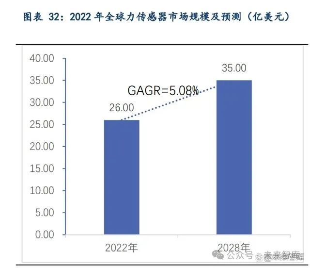 全球力传感器市场预计将持续增长,欧美等地区仍占主要份额。2022 年全球力传感器市场规 模为 26 亿美元,根据 Research and Markets 预测,2028 年全球力传感器市场规模将达到 35 亿美元,2022-2028 年间的复合年增长率预计为 5.08%;对工厂自动化和制造过程高精度的需 求不断上升是推动市场增长的关键因素之一。面对工业自动化以及越来越复杂精细的作业要求, 传感器的需求不断上升,助推了全球力传感器市场的增长;而欧美等企业对传感器的研发起步 较早,具有先发优势,在全球市场中也占据着主要份额。