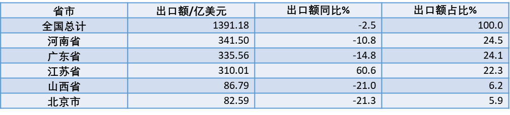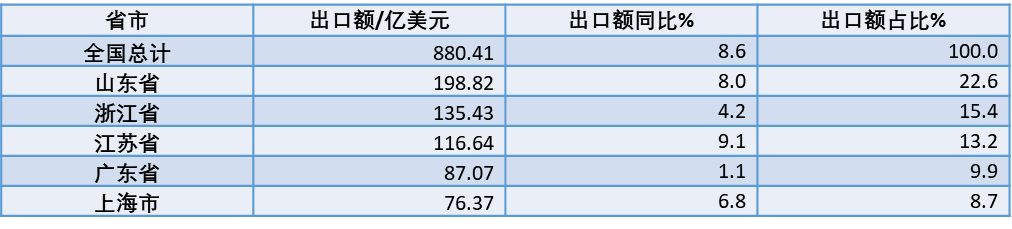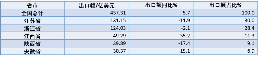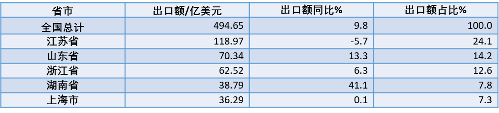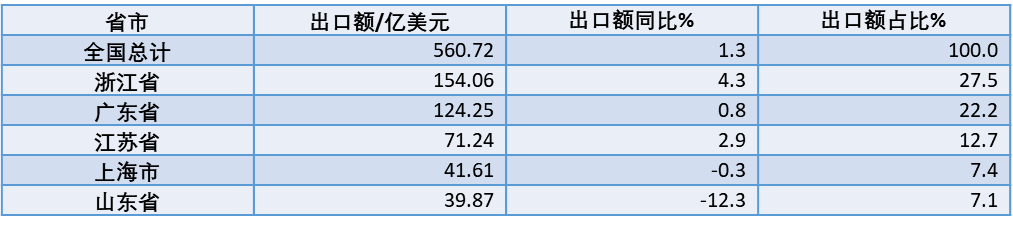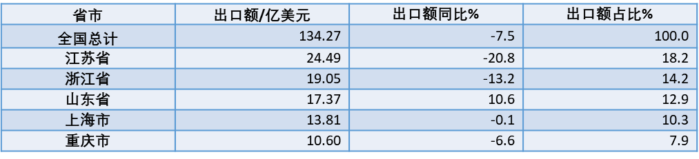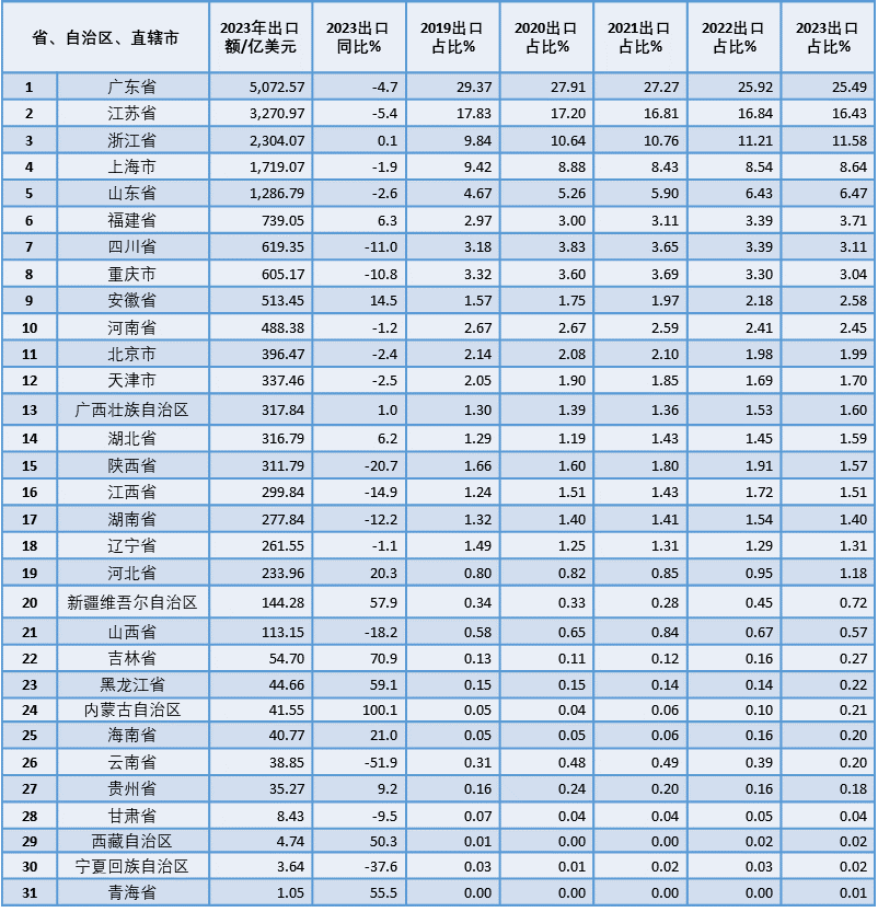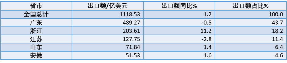 2023年,浙江省出口机电产品2304.1亿美元,同比增长0.1%,是出口额前五个省市中唯一增长的省份。