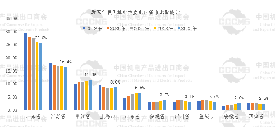 广东是我国机电出口第一大省,2023年广东省出口机电产品5072.6亿美元,占我国机电出口总额25.5%的比重。