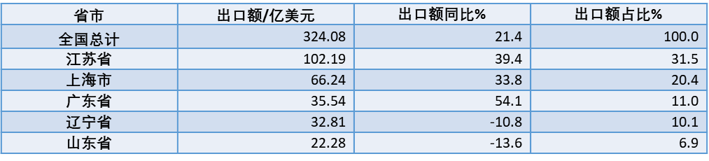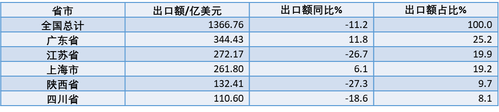 2023年,江苏省出口机电产品3271亿美元,占我国机电出口总额的16.4%,位列第二。