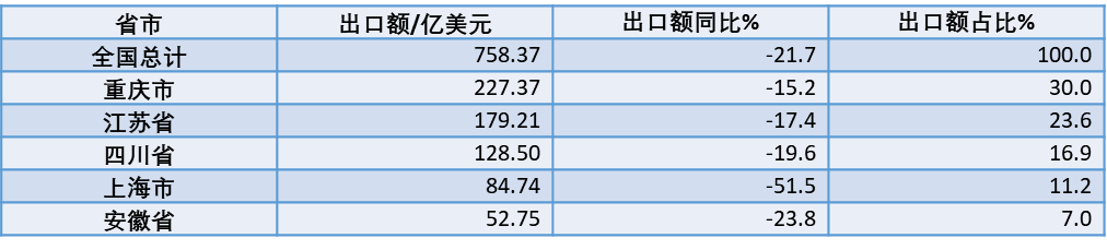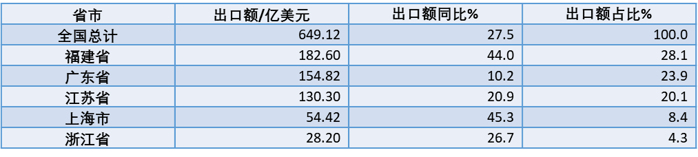 锂离子蓄电池是福建省出口额最高的单一机电产品,2023年出口182.6亿美元,占全省机电出口总额的24.7%,拉动福建省全年机电出口额增长8个百分点。福建省也是我国锂电池出口第一大省,出口额比重占行业的28%。