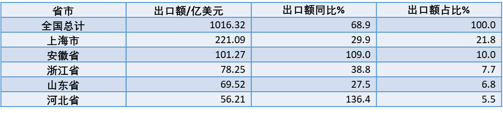 太阳能光伏、日用机械、电工器材、汽车及其零配件、家用电器为浙江重点机电出口行业。2023年,光伏组件是浙江省出口额最高的机电单品,113.6亿美元的出口额占全国光伏组件出口总额的28.7%。电动载人汽车和锂离子蓄电池分别列浙江省出口额第二、第四位的单品。