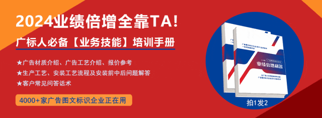 精彩推荐:公司实用生产经营工具集合年前这种KT板堆头火了广告装饰物料又一新品,创意分拉满!未来20天,广告标识企业的新商机告别传统亚克力,展架陈列又有新品1000块不到打造新型网红背景墙痛心!2名临时工安装广告牌不慎坠亡标识标牌+圆柱体+视觉定位,小型UV平板功能有多卷?效率提升270%,喷切一体机又有新升级2024赚钱的广告人可做哪些赛道有机会取代亚克力,标识字新工艺车身广告撕画掉漆,广告公司押金被扣· END · 编辑|Sara 统筹|Jack 视觉|左西/ 广告 / ▲ 力宇 | 点击图片获取更多信息▲墨水 | 诚招全国省市技术服务合伙人▲上海广印展▲广州迪培思广告展▲郑州广告展【业务技能培训手册】 | 点击图片获取- 商务联系 - 印小妹 | 18612108971合作:18612108971(同微)爆料、投稿、采访邀请投稿一经采用将支付400-1000元爆料一经采用将支付400-1000元点击“阅读原文”获取广告行业《业务接单培训手册》材料+工艺+报价+安装资料