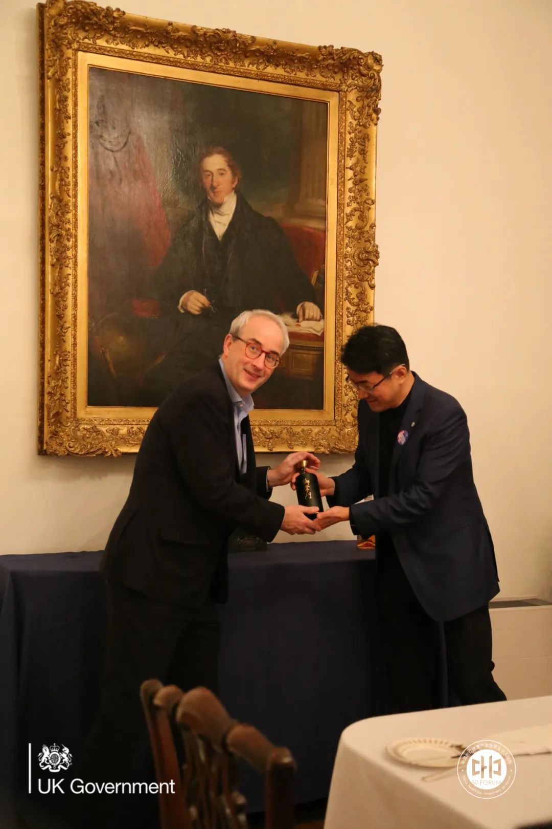 最后英国商业贸易部贸易使节Lewis Neal先生对本次中英医疗健康产业交流活动进行总结致辞,感谢各位嘉宾的参与,同时祝大家龙年新春愉快。英国大使馆官邸晚宴环节,中英双方举行了礼物互换仪式,与会嘉宾们也进行了更加深入的交流并于大使馆官邸合影留念。