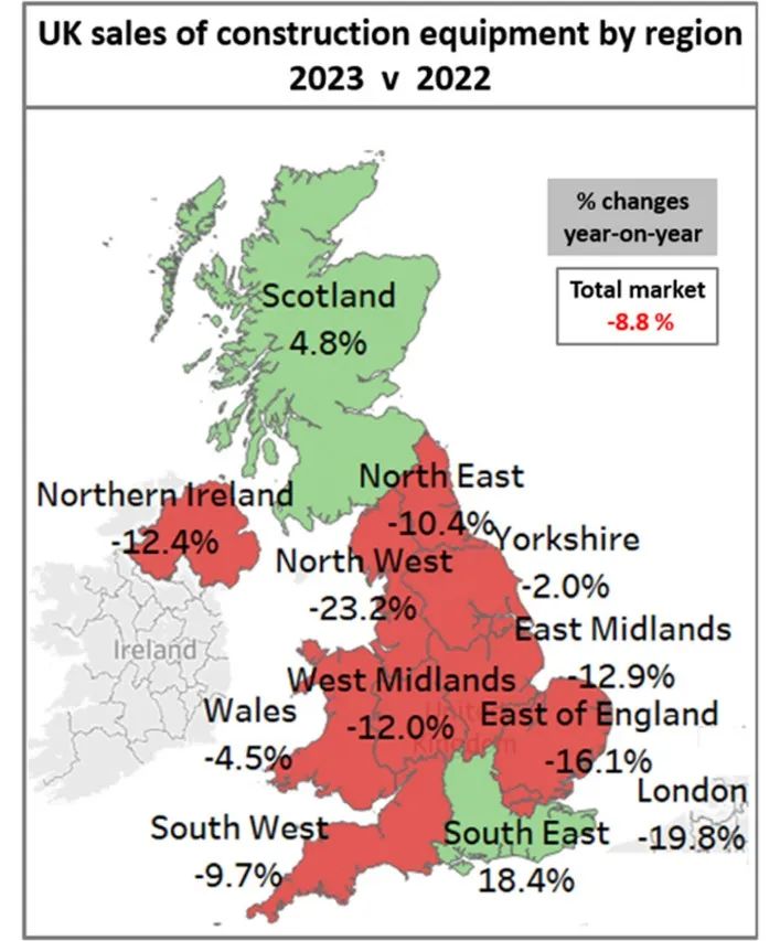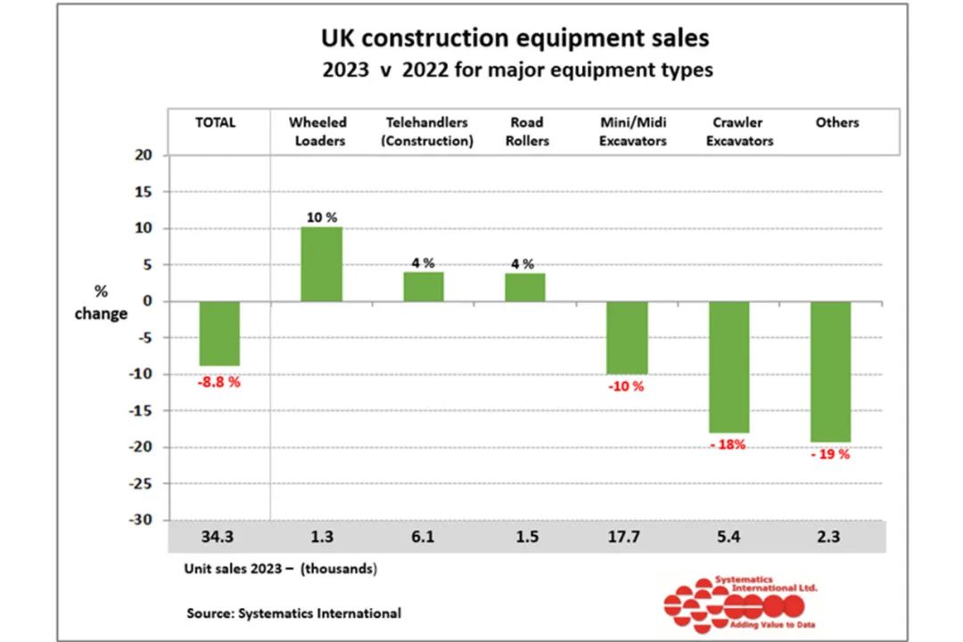 建筑设备协会报告称,12 月份建筑和土方设备的零售额进一步下降,导致第四季度销售额较 2022 年第四季度水平下降 29%。这是自新冠疫情以来的最低季度销量水平,约为 6,500 辆。就全年而言,2023 年销量达到 34,300 辆,比 2022 年水平下降 8.8%。这比 2021 年和 2022 年的设备销量水平低 2,000 至 3,000 台。