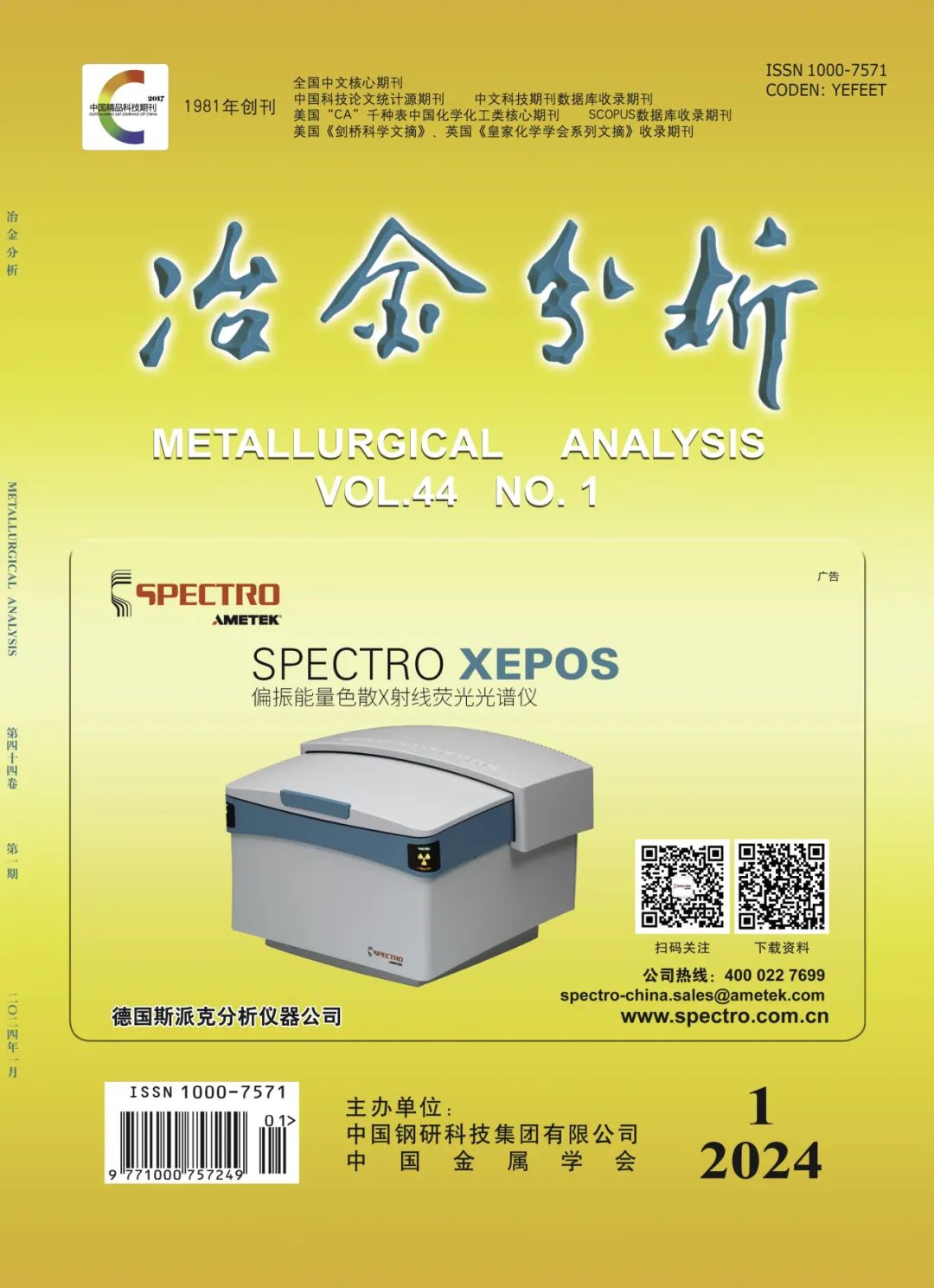 《冶金分析》是由中国钢铁工业协会主管,中国钢研科技集团有限公司和中国金属学会主办的冶金及材料领域权威的分析测试类科技期刊,创刊于1981年,月刊,ISSN 1000-7571,CN 11-2030/TF。本刊旨在动态反映冶金与材料领域分析测试新技术、新方法、先进经验,报道研究成果,发表综述文章,并介绍国内外冶金分析动态等,适合于冶金、材料、矿山、石油、化工、机械、地质、环保、商检等领域或部门的科技人员及科研院校师生参考。