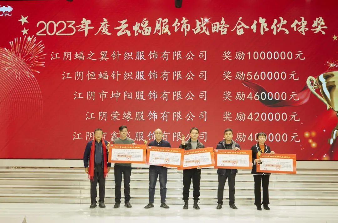 云蝠在2023年进行了车间改革,打破传统制造,招商引入承包商,携手共同成长。在现场,云蝠控股董事长郭健为江阴蝠之翼针织服饰有限公司、江阴恒蝠针织服饰有限公司、江阴市坤阳服饰有限公司、江阴荣缘服饰有限公司、江阴市鑫炎服饰有限公司等5家公司颁发“2023年度云蝠服饰战略合作伙伴奖”。