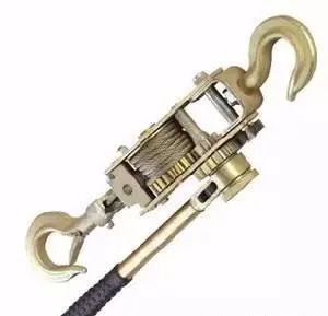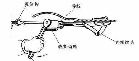 紧线器用来收紧户内外绝缘子线路和户外架空线路的导线,如下图所示。