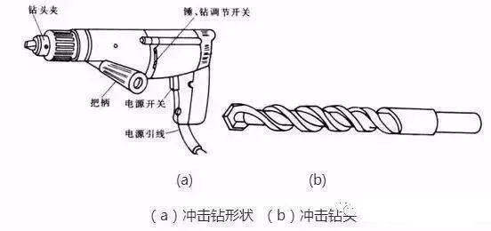 (1)应在停转的情况下进行调速和调档(“冲”和“锤”)时。钻打墙孔时,应按孔径选配专用的冲击钻头,冲击钻头如下图b。