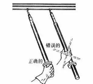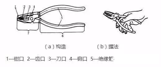 e.钳柄上必须套有绝缘管。使用时的握法如上图b所示。
