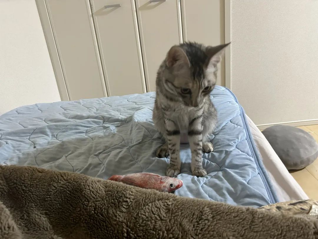 @zakkimerukari 给家里的小猫买了一个小鱼玩具,结果猫每天早上五点都会叼玩具过来,吵着要他陪玩。