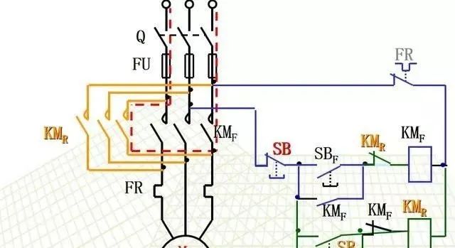 在反转接触器的控制电路中,串接了正转接触器的一个常闭触点KMF。