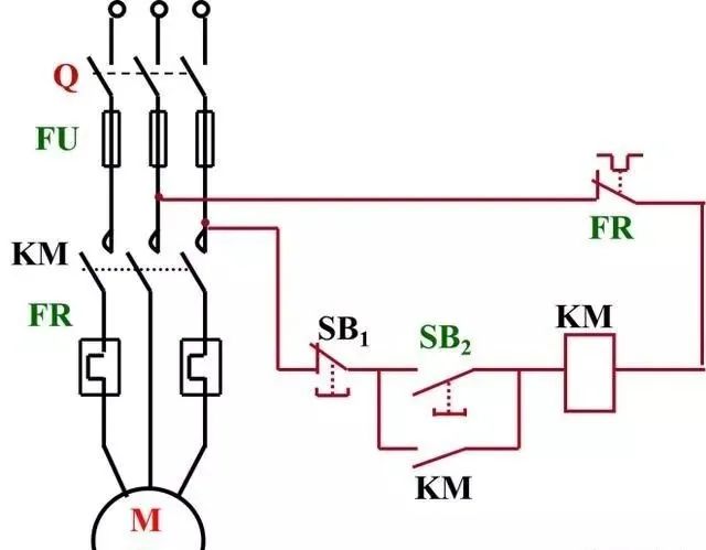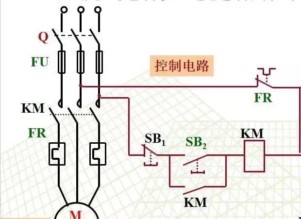 和上闸刀开关Q,按下SB2,接触器线圈KM通电,其主触头和辅助触头同时吸合,电动机运行。按下SB1,控制电路断电,主触头和辅助触头同时断开,电动机停车。
