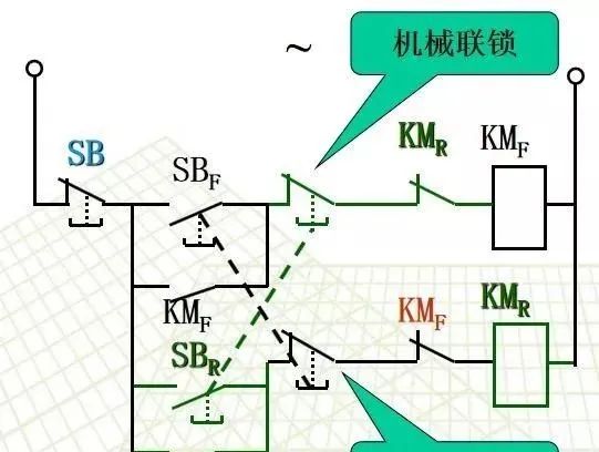 接触器KMF和KMR的这两个常闭辅助触头在控制电路中所起的作用好比是两把锁门用的锁,当一个接触器的线圈带电时,就把另一个接触器的控制电路锁住,所以叫做联锁作用,这两个常闭触头就叫做联锁触头。