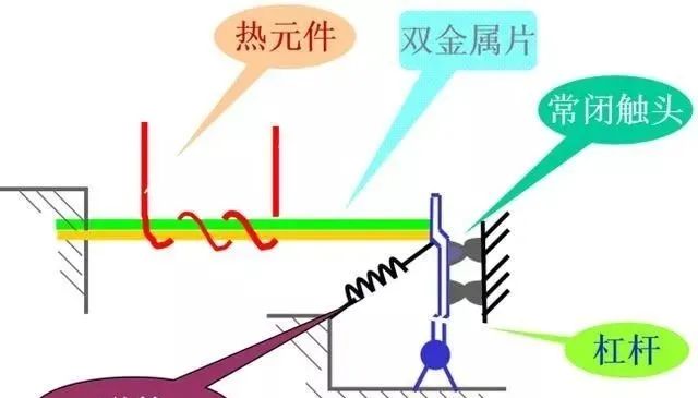 热继电器的主要部分是两个热元件,它是一段电阻不大的电阻丝,绕在双金属片上。使用时,发热元件接入电机主电路,若长时间过载,双金属片被加热。因双金属片的下层膨胀系数大,使其向上弯曲,杠杆被弹簧拉回,常闭触点断开。