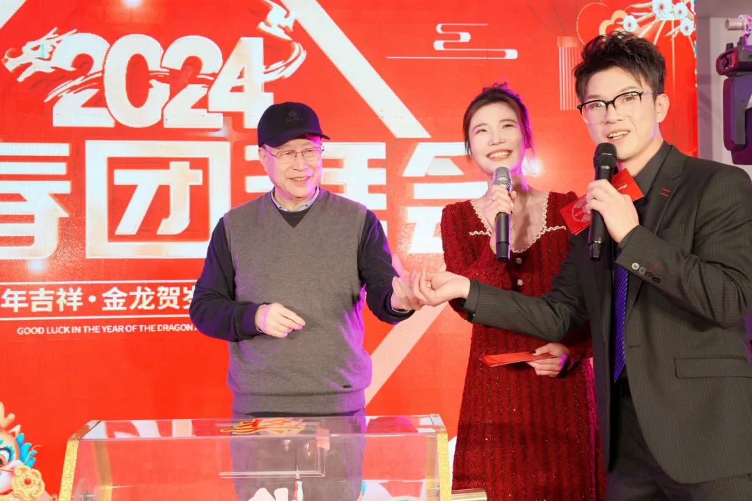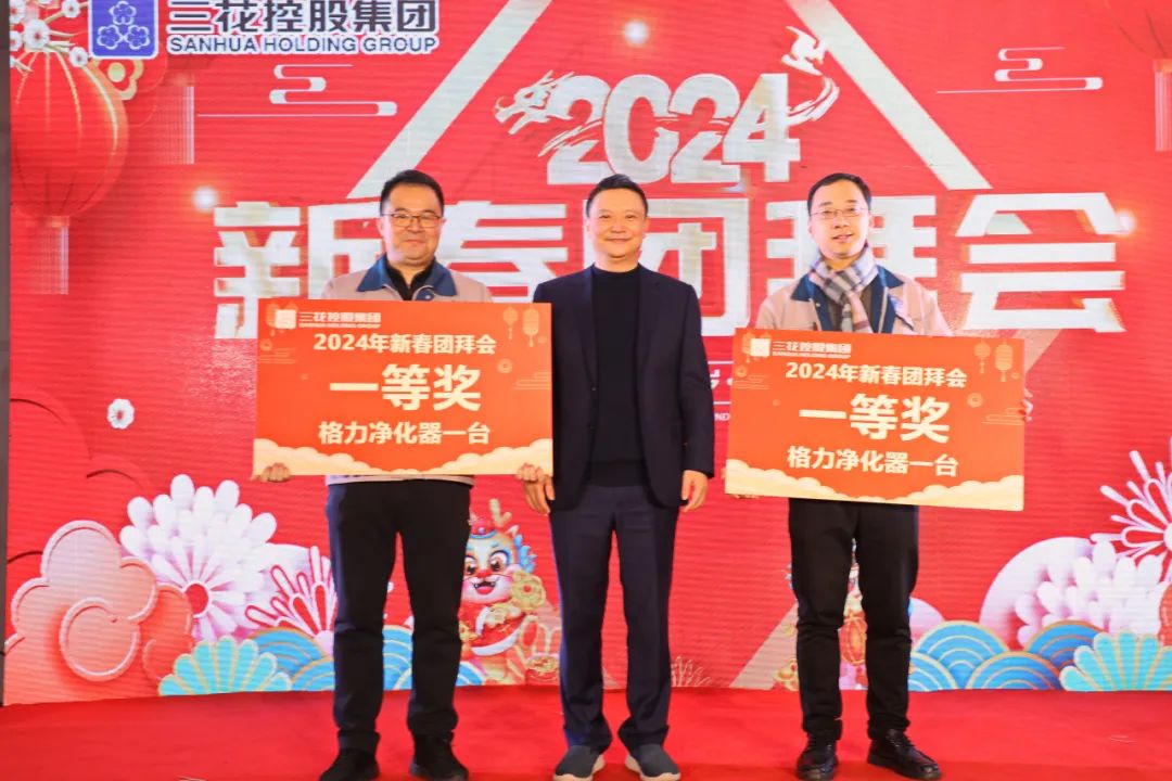 到了备受期待的一等奖环节,由张亚波副主席抽取两名幸运三花人,奖品是净化器一台。台上的中奖者抱得大奖,满脸喜悦,台下的观众欢呼声迭起,都想要沾沾这份新年的好运。