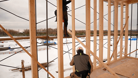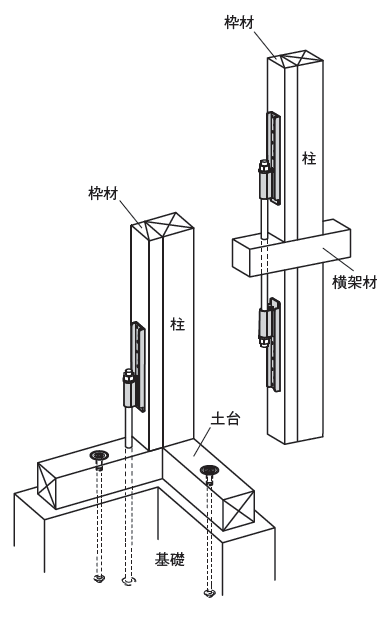 建筑的角部柱通高至屋面,称为“通柱”或“轴柱”;其余柱搭建于横梁之上,称为“管柱”,竖向荷载由屋面传递至横梁,再由横梁传递至“通柱”或“管柱”。抵抗水平作用力的、具有斜撑或钉接覆面板的剪力墙中的小墙骨柱称为“间骨柱”,通常仅起构造作用,不传递竖向荷载。