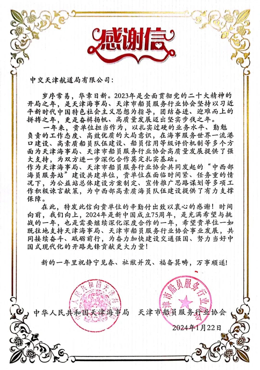 近日,天津海事局与天津市船员服务行业协会联合向公司发来感谢信。信中指出,2023年公司主动担当作为,以扎实过硬的业务水平、勤勉负责的工作态度、高效优质的大局意识,在海事服务世界一流港口建设、高素质船员队伍建设、船员信用等级评价机制等多个方面为天津海事局、天津市船员服务行业协会高质量发展提供了强大支持,为双方进一步深化合作奠定扎实基础。