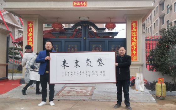 商会会长辛晓林代表广东省江西临川商会向刘国华先生赠送由辛会长本人亲笔题写的“紫气东来”四个苍劲有力的大字,寓意富贵平安、吉祥如意。