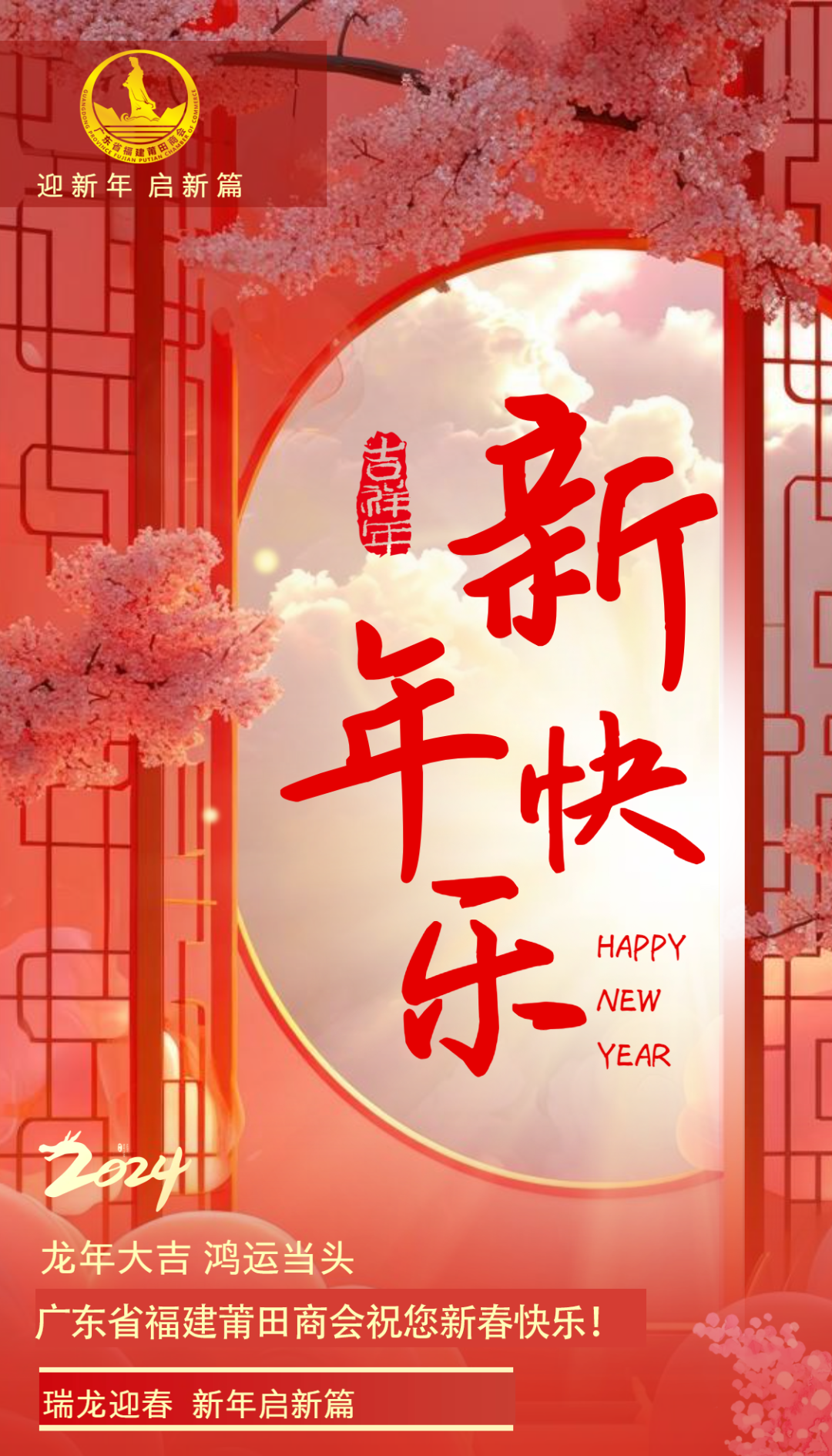 在这新元肇启的美好时刻,让我们共同祝愿伟大的祖国繁荣富强、国泰民安!祝愿广东省福建莆田商会行稳致远,越办越好!祝愿大家在新的一年里身体健康、家庭幸福、事业发达、万事如意!