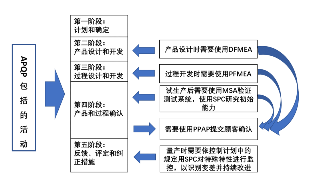 IATF16949中的五大核心工具是指,APQP(先期产品质量策划),FMEA(失效模式及影响分析),MSA(测量系统分析),SPC(统计过程控制),PPAP(生产件批准程序)。这五大核心工具之间的关系如下图: