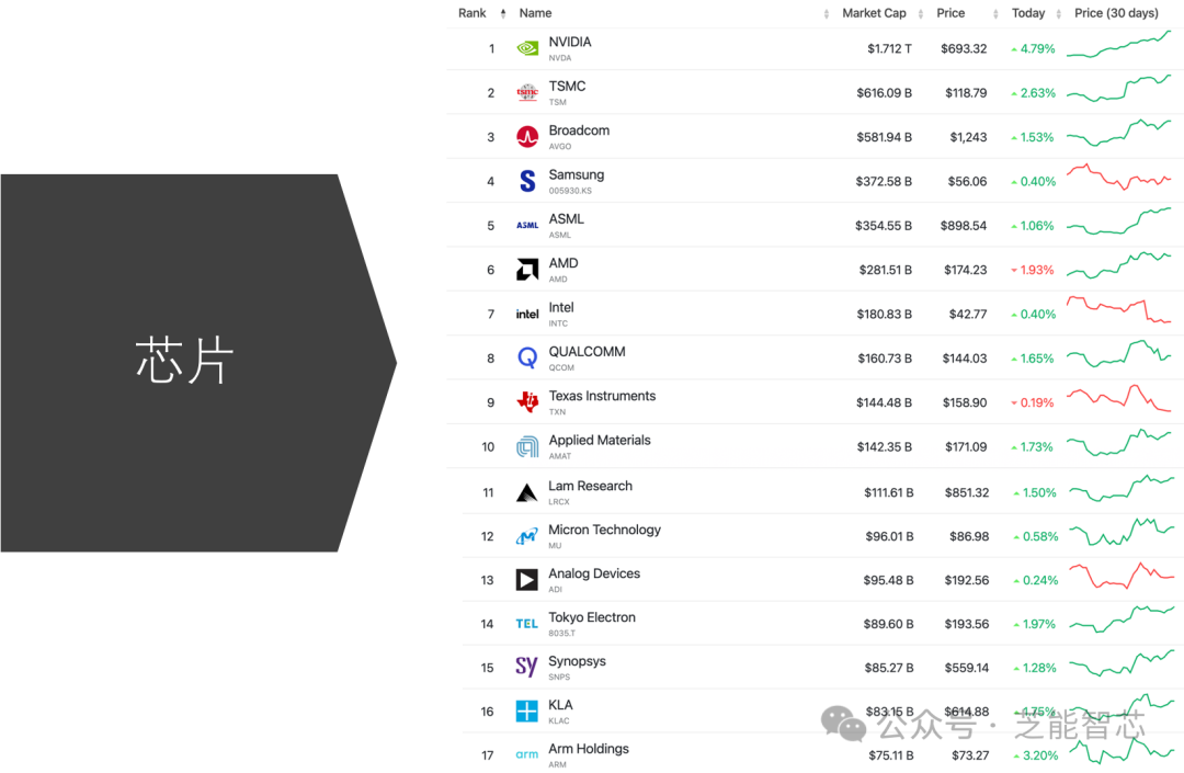 芝能评论:作为三星集团的一部分,三星电子在多个领域都有强大的业务,包括半导体,这里最大的问题是,芯片制造方面和台积电在努力追赶,HBM上和SK海力士在打来打去。芝能评论:阿斯麦作为光刻机制造商在半导体生产中发挥着关键作用,其市值反映了其在半导体制造领域的重要性。在全球芯片需求不断提升下,各个区域都想要牢靠的芯片制造基地。芝能评论:作为CPU和GPU行业的重要参与者,超威半导体的市值反映了其在这两个领域的竞争力。谁想到现在超过了老大哥英特尔,当然廉价的GPU和AI算卡还是杀手锏。芝能评论:英特尔是全球最大的CPU制造商之一,落伍了,也在不断适应市场变化。芯片制造行不行还不知道,在服务器领域节节败退。芝能评论:作为全球最大的无线通信芯片提供商之一,高通在移动通信领域发挥着关键作用。手机销量下降,对于高通影响很大,随着边缘AI兴起,有望雄起的。芝能评论:德州仪器在模拟和数字半导体领域有着广泛的应用,其市值反映了其在电子元件市场中的重要性。当然半导体还在去库存阶段,TI这边主打一哥稳定。应用材料公司(Applied Materials)