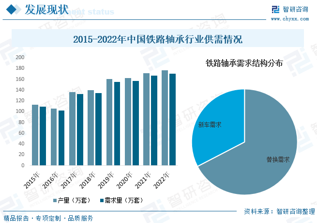 随着近年来我国铁路行业的快速发展,铁路运输设备数量也随之不断增加,推动了我国铁路轴承需求的增长,同时,在我国铁路轴承技术不断研发突破下,铁路轴承国产替代进程稳步推进,行业产量也随之稳步增长。据资料显示,2022年我国铁路轴承产量约为176.4万套,同比增长2.7%;需求量约为170.3万套,同比增长2.2%。其中,替换需求占比约为67.4%,新车需求占比约为32.6%。