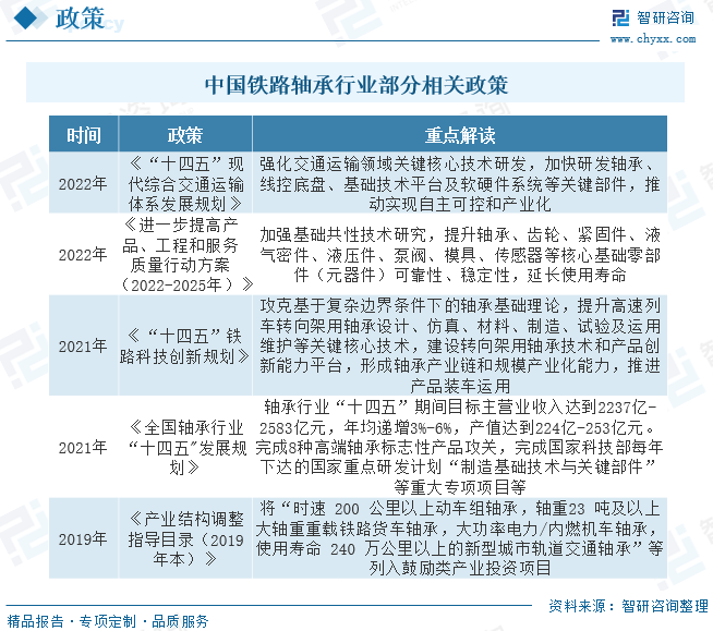 近些年来,为了促进轴承行业的发展,国家有关部门陆续出台了一系列相关政策,为行业的发展提供了良好的政策环境。如2022年发布的《“十四五”铁路科技创新规划》攻克基于复杂边界条件下的轴承基础理论,提升高速列车转向架用轴承设计、仿真、材料、制造、试验及运用维护等关键核心技术,建设转向架用轴承技术和产品创新能力平台,形成轴承产业链和规模产业化能力,推进产品装车运用。