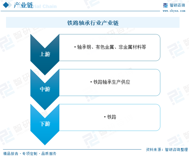 铁路轴承行业产业链上游为原材料环节,主要包括轴承钢、有色金属、非金属材料等;中游为铁路轴承生产供应环节;下游主要应用于铁路行业。