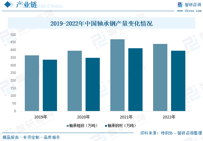 改革开放以来,特别是进入新世纪以来,我国轴承钢技术质量特别是纯净度与夹杂物控制水平,有了长足的进步。同时,在近年来行业下游汽车、机床、机械等领域快速发展的带动下,我国轴承钢需求量保持持续增长的态势,进而推动了我国轴承钢产量的增长。据资料显示,2022年我国主要优特钢企业轴承钢材产量为397.27万吨,同比下降3.9%;轴承钢粗钢产量为440.12万吨,同比下降6.4%。