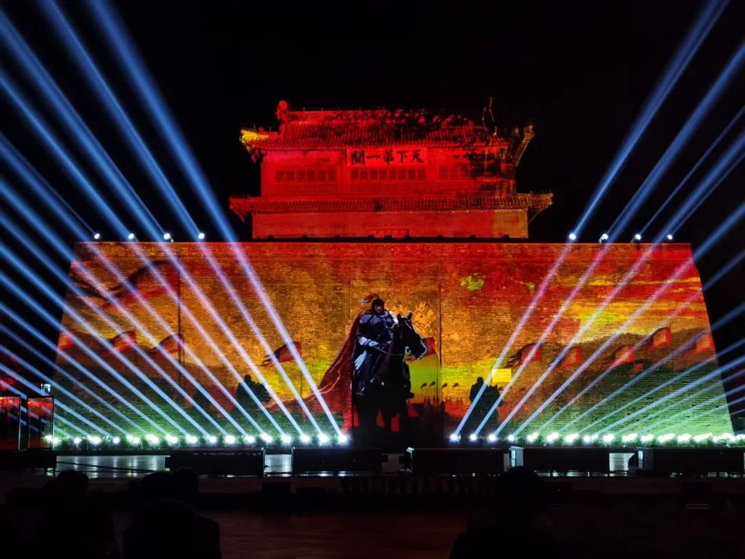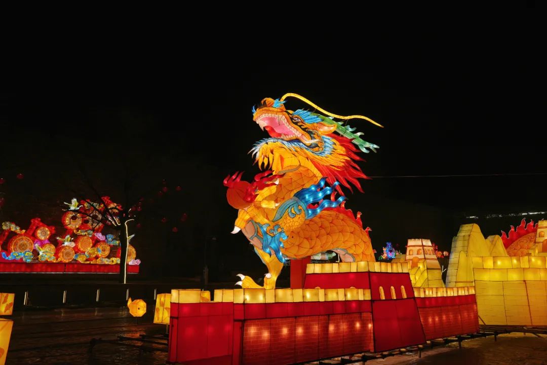 西大街设置年博会主题门头灯组,东大街道路两侧的33棵树上悬挂各色传统花灯;一关广场多组展现国风古韵、地域特色的梦幻灯组,点亮古城夜空;特别是瑞莲阁湖面用龙和山、海、关、长城等元素创作的“龙腾万里”巨型灯组,成为本次灯展的点睛之笔。四条大街屋檐悬挂近千组火红的灯笼,打造灯火古城,增添喜庆的春节氛围。